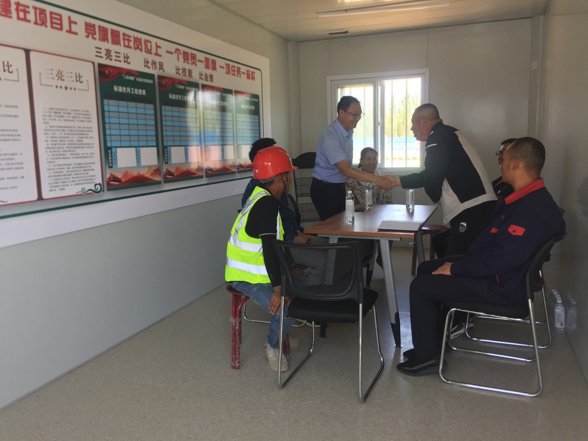 告別了AMD項目組,前往集寧某施工項目組,等我們到來的時候,項目的管理人員已經在門口迎接我們,得知我們這次活動是黨支部書記親自帶隊,項目上甲方黨支組織也表示熱烈歡迎,并且進行了黨史學習的交流,并確定后續將聯合項目的甲方、監理方、施工方開展一次紅色文化交流活動。
