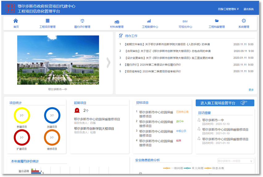 該平臺(tái)由工程項(xiàng)目管理、履約評(píng)價(jià)管理、材料庫(kù)管理、工程數(shù)據(jù)中心、BIM可視化中心、工程檔案管理六個(gè)子系統(tǒng)組成。主要包含了立項(xiàng)管理、前期手續(xù)管理、招投標(biāo)管理、合同管理、設(shè)計(jì)管理、施工現(xiàn)場(chǎng)管理、投資控制、工程驗(yàn)收、質(zhì)保期管理、項(xiàng)目后評(píng)價(jià)、參建單位履約評(píng)價(jià)、工程檔案管理、工程數(shù)據(jù)中心、BIM可視化中心、等功能,對(duì)近40個(gè)業(yè)務(wù)單位進(jìn)行精細(xì)化管理。