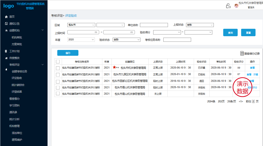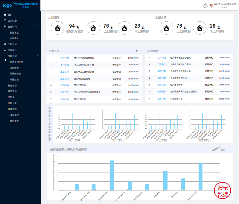 主要實現(xiàn):對創(chuàng)建機構(gòu)和上報方案的審批、下發(fā)督辦任務(wù)、創(chuàng)建考核任務(wù)并對創(chuàng)建單位驗收評定星級。還可以查看黨政機關(guān)上報的工作計劃、查看黨政機關(guān)的自查整改記錄,對黨政機關(guān)工作的催辦已經(jīng)對低碳節(jié)約相關(guān)資料的維護。